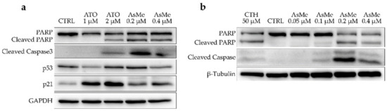 (a) Western blot for apoptosis and negative cell cycle markers in COMI cells treated for 48 h with concentration at or above the GI50 value of ATO or 7. Representative results of n = 3 biological replicates. (b) Western blot for apoptosis and negative cell cycle markers in COMI cells treated for 48 h with 0.05, 0.1, 0.2, and 0.4 μM of 7. Treatment with 50 μM of camptothecin (CTH) for 16 h was used as a positive control for apoptosis. Representative results of n = 3 biological replicates.