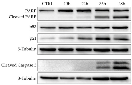 To further investigate the timing of apoptosis induction exerted by 7, COMI cells were treated with 0.2 μM of 7, and immunoblot analyses of apoptosis and cell cycle regulation markers were performed at different time points (10 h, 24 h, 36 h, 48 h) (Figure 6). In COMI cells treated with 0.2 μM of 7, very little apoptosis was detected in the first 24 h, whereas a minor increase in p21 protein levels was observed. Subsequently, at 36 h, apoptotic markers started to increase and reach their maximum at 48 h, whereas instead p21 levels decreased slightly.