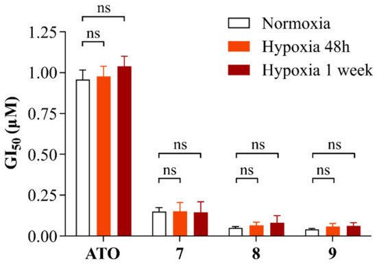 GI50 values of COMI cells treated with ATO, 7, 8, or 9 under normoxic conditions, under hypoxic conditions, or after being grown in hypoxia for 1 week. n = 6 biological replicates, mean ± SEM. A two-tailed t-test was performed using GraphPad Prism to assess the significance of the observed difference (ns: not significant). The numeric GI50 values can be found in Table S4.