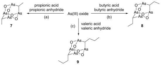 Of note, the reactions with homologous combinations of carboxylic acid and corresponding anhydrides show an increasing selectivity in product formation. This phenomenon can be ascribed to a growing steric effect pushing reaction to produce compound 7 as the very major product and 8 and 9 as single products. Furthermore, the steric hindrance was observed to be decisive in moving from linear to bulkier alkyl reagents (branched, as isobutyric and isovaleric, or aromatic acid/anhydride) which did not allow the formation of the tetraarsenic adamantane structures. Conversely, the use of acetic acid/acetic anhydride for the production of the tetraarsenic cage with no chain provided a series of four products, whose relative ratios were not altered by carrying out the reaction using conventional heating or replacing it by microwave irradiation [12].