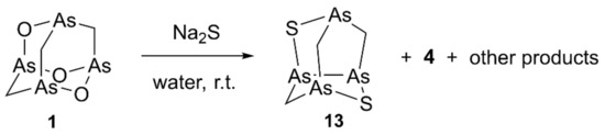 By reacting arsenicin A with Na2S in water, the formation of a series of products presenting sulfur atoms in place of the oxygen atoms in the adamantane cage was reported [11]. In detail, the trisulfide product formed from arsenicin A undergoes reductive desulfurization leading to the formation of a nor-adamantane structure characterized by an As-As bond. The amount of the products obtained depends on the molar equivalents of sulfide salt used, the reaction time, and the reaction temperature [11].