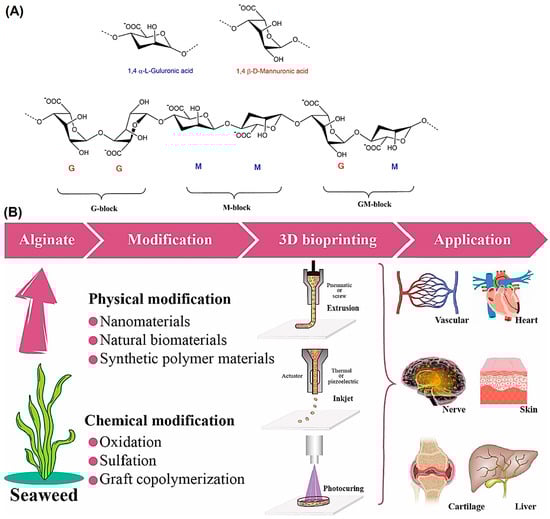 (A) The conformation of monomers and block distribution of alginate. Adapted from Ref [18] with permission, Copyright 2020 Springer Nature, licensed under the terms of the Creative Commons Attribution License (CC BY). (B) The physical/chemical modification processes, 3D bioprinting techniques, and TE-RM applications of alginate hydrogels. Adapted from Ref. [19] with permission. Copyright 2023 Elsevier.