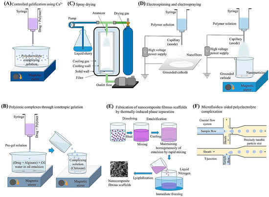 Alginate and its hydrogels have been widely employed in TE-RM due to its outstanding properties in terms of hygroscopicity, biocompatibility, biodegradability, non-toxicity, flexibility, and chelating ability [24,28,29]. However, alginate alone has some drawbacks (high viscosity, low solubility, poor degradability, etc.) which hinder its potential for further biomedical applications [30]. To overcome this problem, a wide range of natural or synthetic biomaterials have been incorporated into the alginate structure to enhance its properties and multifunctionality [30]. In addition, modifications of alginate hydrogels with various nanomaterials have recently garnered immense attention, leading to their wide-ranging applications in the biomedical field [17]. There are several fabrication methods deployed for synthesizing alginate-based nanomaterials, the most prominent ones being illustrated in Figure 3. These methods include but are not limited to the controlled gelification, spray drying, electrospinning/electro-spraying, ionotropic gelation, thermally-induced phase separation, microfluidics-aided polyelectrolyte complexation, etc. [17,27,28,30].