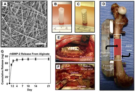 (A) Scanning electron microscopy (SEM) image of electrospun nanofiber mesh, showing the smooth and bead-free nano-scaled fibers. (B) Hollow tubular implant without perforations constructed from nanofiber meshes. (C) Tubular implant with perforations. (D) The composite was constructed from an electrospun nanofiber mesh tube applied for repairing the bone defect. (E) Picture of the defect after placement of a perforated mesh tube; the alginate inside the tube can be seen through the perforations. (F) A specimen was taken down after one week and the mesh tube was cut open. The alginate was still present inside the defect, with a hematoma present at the bone ends. (G) The release kinetics of alginate >21 days (in vitro); sustained release of the rhBMP-2 could be detected during the first week. Adapted from Ref. [74] with permission. Copyright 2010 Elsevier.