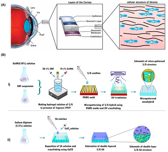 (A) The representative corneal stroma structure (layers of the cornea and cellular structure of stroma). (B) The preparative process of (i) micro-patterned silk nanofibril (SNF) incorporated gelatin methacrylate (S/G) composite films through a micro-molding technique, under ultraviolet light, and (ii) double-layer micro-patterned S/G-sodium alginate (SA) film, after crosslinking of SA using CaCl2 solution. GelMA: gelatin methacrylate. Adapted from Ref. [89] with permission. Copyright 2021 Elsevier.