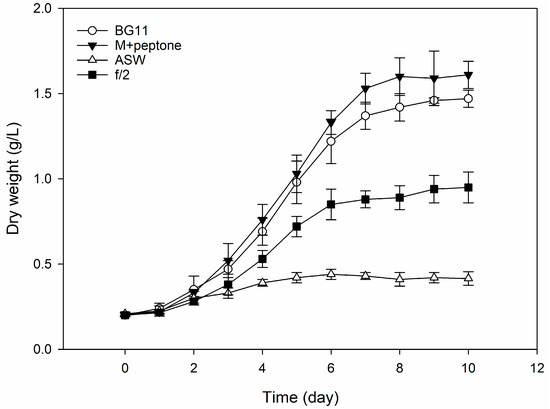 Significant differences were observed between the Guillard F/2 medium and BG11. In fact, the latter reported significantly higher productivity with respect to the F/2 medium, reporting a biomass DW after 10 d of 1.5 g L−1 in comparison to the 0.87 g L−1 of the F/2 medium. The ASW reported no significant growth, only doubling the initial biomass concentration (0.41 g L−1).