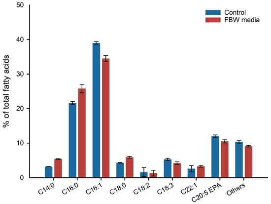 On the other hand, Figure 5 shows the fatty acid profile of P. tricornutum grown with BG 11 (control) and optimized food-waste-based medium.