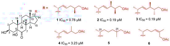 Steroids, containing a basic 17 carbon atom-formed perhydrocyclopentanophenanthrene skeleton, represent a polycyclic compound superfamily including sterol, bile acids, sex hormones, molting hormones of insects, adrenal cortical hormones and other physiologically active substances [1]. Steroids widely exist in plants, animals, microorganisms and other living organisms and possess significant and distinct roles in the construction of cell membranes, cell stability and growth, proliferation, cell function and other cell biological processes [1,2,3]. Therefore, numerous steroid compounds play essential roles in the treatment of various human diseases including cancer, inflammation, infection, metabolic diseases, cardiovascular diseases, heart diseases, neurological disorders and other human diseases [4,5,6,7,8,9,10,11]. Especially, the tetracyclic ring steroid plays a significant role in drug discovery [12,13]. Due to the wide application in human diseases’ therapy and drug discovery programs, the identification of new bioactive steroids has attracted lots of attention from the pharmaceutical industry and academia.