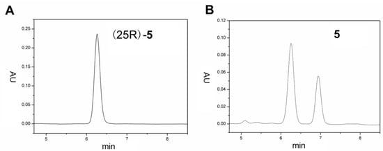 As shown in Figure 2 and Figure S6, compounds (25R)-5 and 5 were analyzed by high-performance liquid chromatography (HPLC) to confirm that compound (25R)-5 was one isomer of compound 5. As expected, compound (25R)-5 only showed one peak, with the retention time of 6.262 min; in contrast, compound 5 possessed two peaks, with the retention times of 6.255 and 6.944 min, respectively.