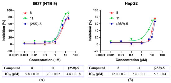 Then, the IC50 values of compound (25R)-5 and intermediates 8 and 11 were investigated against 5637 (HTB-9) and HepG2 cancer cell lines, as summarized in Figure 3. As depicted in Figure 3A, all three compounds displayed similar micromolar IC50 values (5.8 µM for 8, 3.0 µM for 11 and 4.8 µM for (25R)-5, respectively) against 5637 (HTB-9) cancer cells. Interestingly, intermediate 11 proved to be the best compound against HepG2 cancer cells, with an IC50 value of 5.6 µM (Figure 3B). Additionally, compound (25R)-5 and intermediate 8 showed very similar anti-proliferation activities against HepG2 cancer cells, with an IC50 value of 15.5 µM and 12.0 µM, respectively (Figure 3B). Taken together, compound (25R)-5 represented a promising drug discovery lead towards human liver cancer and is worthy of further discovery.