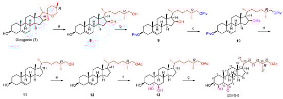 Semi-synthesis of (25R)-5. Reagents and conditions: (a) Zn dust, HCl, EtOH, reflux, 1.5 h, 78%; (b) pivaloyl chloride, pyridine, THF, 0-rt, overnight, 49%; (c) methanesulfonic anhydride, pyridine, 0-rt, overnight, 99%; (d) LiAlH4, Et2O, reflux, 10 h, 91%; (e) acetyl chloride, Et3N, DMAP, CH2Cl2, overnight, 42%; (f) (i) magnesium monoperoxyphthalate hexahydrate, acetone, reflux, 30 min; (ii) Bi(OTf)3, acetone, rt, 1 h, 41%; (g) N-bromosuccinimide, acetic acid, acetone, H2O, 0-rt, 1 h, 47%.