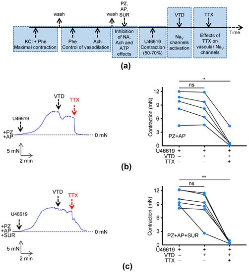 - Berra-Romani, R.; Blaustein, M.P.; Matteson, D.R. TTX-Sensitive Voltage-Gated Na+ Channels Are Expressed in Mesenteric Artery Smooth Muscle Cells. Am. J. Physiol.-Heart Circ. Physiol. 2005, 289, H137–H145. [Google Scholar] [CrossRef]