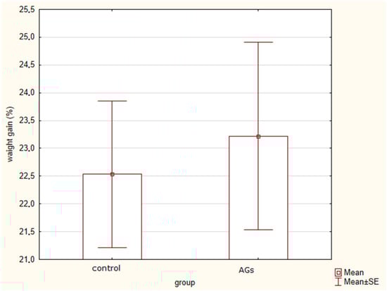 At the preliminary stage of the experiment (treatment with AGs before the onset of stress exposure), there were no significant differences (t = 0.3; p = 0.76) in the general body weight gain between animals treated with AGs (general body weight gain 23.2 ± 5.6%) and animals in the control group (general body weight gain 22.5 ± 4%) (Figure 1).