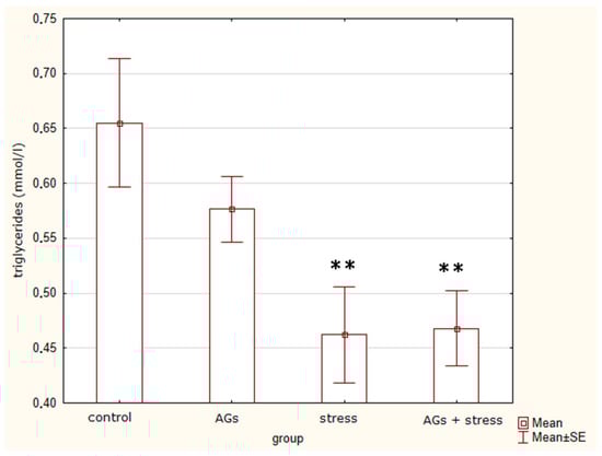 Table 1 shows the parameters of lipid metabolism in rats after the end of the experiment. An analysis of variance (H = 9.24; p = 0.0262) revealed differences between groups in triglyceride concentrations (Figure 2). Treatment with stress and AGs leads to a decrease in triglyceride levels. There were significant differences between control rats and stressed animals (t = 2.7, p = 0.03), as well as between rats treated with AGs and subjected to stress (t = 2.9, p = 0.02), but not between the control group and the group treated with AGs (t = 1.33; p = 0.22), or between stressed animals and those treated with AGs before stress (t = −0.1; p = 0.91).