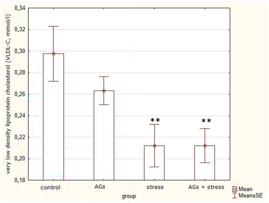 In addition, using an analysis of variance, we determined differences (H = 9.68; p = 0.0215) among rats in the concentration of VLDL-C (Figure 3). Exposure to stress (t = 2.69, p = 0.03) and stress with AGs (t = 2.96, p = 0.02) lead to a decrease in VLDL-C levels. Treatment with AGs decreased VLDL-C levels, but insignificantly (t = 1.31, p = 0.23) compared to the control group. Additionally, treatment with AGs before stress only insignificantly increased VLDL-C levels (t = 2.0, p = 0.1). So, only stress influenced VLDL-C levels significantly.