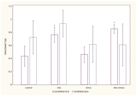The fatty acid composition of the plasma total lipids of rats is presented in Appendix C. Significant differences in the composition of the main fatty acids were not found. Figure 4 showed a change in the level of plasmalogens in the ratio 16:0 DMA/16:0 FAME in experimental groups. Under the action of AGs (p < 0.05), the concentration of 16:0 DMA increased in groups with oral administration of AGs compared with control animals.