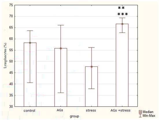 There was a significant difference between the groups in terms of lymphocytes percentage (H = 8.49; p = 0.037) (Figure 5). The Mann–Whitney test revealed differences between the control group and the animals treated with AGs against the background of stress (Z = −2.08; p = 0.03) and between the stress-control group and the animals treated with AGs against a background of stress (Z = −2.33; p = 0.016). So, the percentage of lymphocytes decreased under stress action and vice versa increased in the stress group treated with AGs.