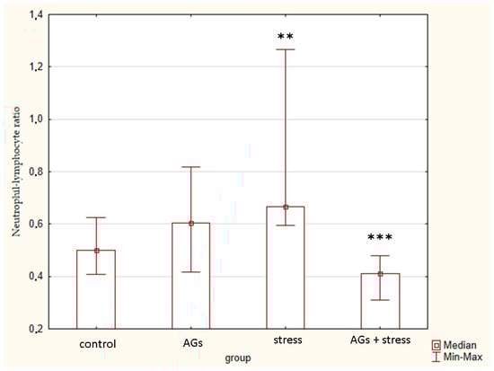 The neutrophil–lymphocyte ratio also differed between the groups (H = 9.15; p = 0.0273) (Figure 6). In animals subjected to chronic stress, the ratio was higher than in the group treated with AGs against the background of stress (Z = 2.33; p = 0.016), and higher than in the control group.