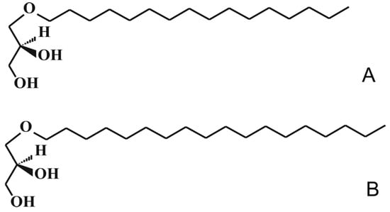 The chemical structure of alkylglycerols. (A)—chimyl alcohol, (B)—batyl alcohol.