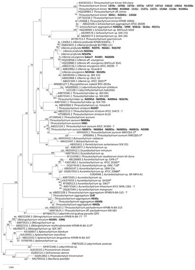 The strains of the collection were assigned to eight different clades within the Thraustochytriaceae. One group of strains was closer related to the Rhizophydiales. The phylogenetic tree obtained is essentially similar to those in recent publications [63,64,65,78,87,88,89,90,91]. It was divided into two main clades, one containing only Thraustochytriaceae and one comprising Thraustochytriaceae and the Labyrinthulaceae. Strains N557a and N1694d were assigned to S. aggregatum and T. kinnei, respectively. This corresponds to their previous classification [61,62,92].