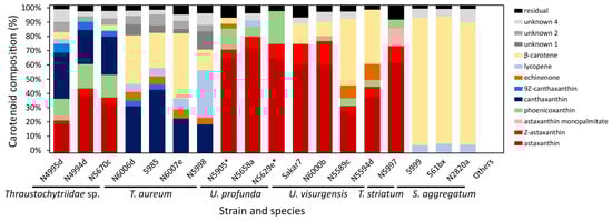 Carotenoid composition of the analyzed strains. Mean values of the individual experiments from each strain whose share in the total carotenoids exceeded 3% are displayed individually (Table S5). Diastereomers of astaxanthin are summarized as “Z-astaxanthin”. “Others” comprises all tested strains assigned to T. kinnei (N1694d, 1462d, 1465d, N1476c, N1709d, 3041c), T. aggregatum (4992b, 154f), andO. minutum (N5995). Strains that grew only on media with high salinity are marked with asterisks.