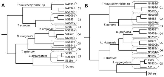 Hierarchical clustering of the analyzed strains based on their carotenoid profiles. Clusters calculated by k-means algorithm were highlighted by dashed boxes. (A) Clusters excluding carotenoid patterns of U. profunda N5629e and N5905. (B) Clusters including carotenoid patterns of U. profunda N5629e and N5905 (marked with asterisks) cultivated on media with a high salt concentration. “Others” comprises all tested strains assigned to T. kinnei (N1694d, 1462d, 1465d, N1476c, N1709d, 3041c), T. aggregatum (4992b, 154f), and O. minutum (N5995).