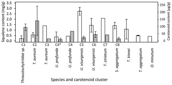 Mean squalene (empty bars) and carotenoid (shaded bars) content of strains belonging to the same carotenoid cluster (Figure 3B). Strains that grew only on media with high salinity are marked with asterisks. Whiskers indicate the standard deviation between the different strains of a cluster. Dry weight was approximated using data from the other trials.
