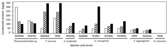 Carotenoid content varied between 0 and 346.1 µg/g in the different strains and media (Figure 5). For all strains except Thraustochytriidae sp. N5670c and N4994d, the highest carotenoid content was measured when grown on medium 15, with maximum values of 343 and 346 µg/g in T. aureum N6006d and 5985, respectively. The carotenoid compositions were consistent with those described in the cluster analysis. The media nevertheless had an influence on the exact carotenoid composition (Figure 6 and Table S10).