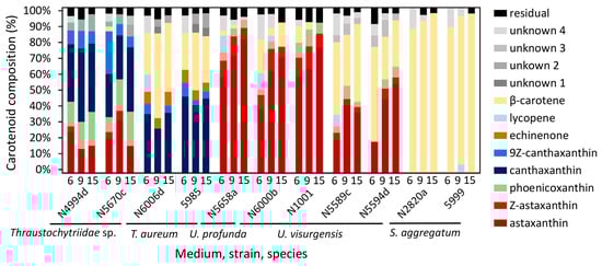 Carotenoid composition of the analyzed strains cultivated on medium 6, 9, and 15. Individually displayed are only carotenoids whose contribution to the total carotenoids was above 3% (Table S10). Diastereomers of astaxanthin are summarized as “Z-astaxanthin”.
