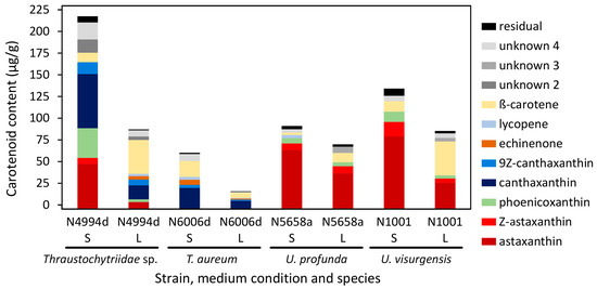 Representative strains of four species with a high carotenoid production were chosen for a comparative study. Thraustochytriidae sp. N4994d, T. aureum N6006d, U. profunda N5658a, and U. visurgensis N1001 were cultivated on DoE medium 7 either in liquid or solid culture. In liquid culture, biomass densities of 1.1, 1.0, 0.6, and 0.7 g/L were reached for N4994d, N6006d, N5658a, and N1001, respectively. On solid medium, the CDW of the cultures scraped from the agar was 25.0, 30.7, 29.7, and 28.1% w/w, and biomass yields of 1.4, 1.8, 1.5, and 1.3 g/L were harvested for strains N4994d, N6006d, N5658a, and N1001, respectively. Extract yield was higher on the solid media (Table S9). The carotenoid content varied from 16 µg/g in N6006d in liquid medium to 218 µg/g in N4994d on solid medium (Figure 8). The carotenoid compositions of the strains cultivated on solid medium were similar to those observed in the previous experiment. U. visurgensis N1001 fitted to the other strains of the genus Ulkenia. A higher carotenoid content was measured in all strains cultivated on solid medium than in liquid medium. It was 1.3-fold higher in U. profunda N5658a and 3.8-fold higher in T. aureum N6006d. The carotenoid patterns changed according to the cultivation condition (Figure 8 and Table S11). The percentage of β-carotene increased in all strains when cultivated in liquid medium, whereas the percentage of astaxanthin, phoenicoxanthin, and canthaxanthin decreased. Thraustochytriidae sp. N4994d exhibited the greatest differences in carotenoid composition when the cultivation medium was changed.