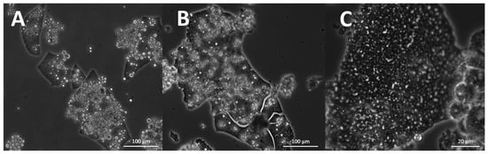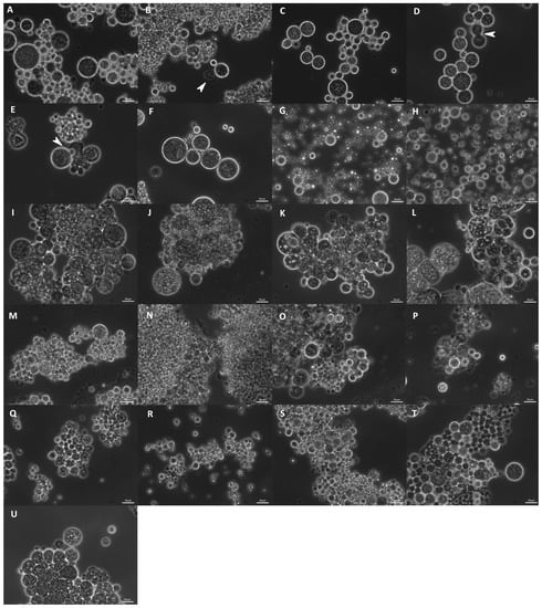 The studied strains differed in their morphology. Cell size varied from approximately 2 to 80 µm, and different cell shapes were observed. Cell size and form varied not only between the different strains but also changed after the cultivation of the same strain in different media. All strains were compared after growth in B1TMG (2.5 mL), the basal medium and positive control for the subsequent growth and optimization studies. Most strains exhibited healthy cells in this medium (Figure 9). All strains had a wide cell size distribution at all observed growth phases. Strains closely related to Ulkenia spp. (Figure 9A–F) showed many globose cells with highly refractive cell walls. In U. profunda N5658a and U. visurgensis N5594d and Sakar 7, “hatching” cells were observed, i.e., the inner part of a cell slowly left its cell wall through a small spot (Figure 9D,E). The cell wall remained nearly intact. The resulting protoplasts were perfectly globose and did not resemble an amoeba. This behavior was observed in mature and comparably large cells. T. aureum N6006d and N6007e (Figure 9S,T) also formed round cells but were more densely packed. Their cell walls were not as refractive as in Ulkenia spp. except for some larger cells (>25 µm). T. aureum 5985 (Figure 9U) differed from the other two strains with generally larger and more irregular cells. T. kinnei N1694d and N1476c (Figure 9O,P) formed more clusters with fewer single cells. The cells of S. aggregatum 561bx, N2820a, and 5999 (Figure 9I–K) had a granular sub-structure. S. aggregatum 561bx, in particular, showed intracellular bodies. Single cells of S. aggregatum were among the largest observed (30–50 µm), and dense clusters of cells with difficult to distinguish and irregularly shaped cells were observed in medium 3. O. minutum N5995 and especially 5996 (Figure 9M,N) formed clusters of comparably small cells. In cultures of T. striatum N5997 (Figure 9L), the largest cells up to 80 µm were observed. Its cells exhibited finer and coarser substructures and vacuole-like compartments. Thraustochytriidae sp. N5670c and N4994d (Figure 9Q,R) were more dispersed and showed smaller agglomerates with smaller cells and cellular structures that might have been small sporangia (10–15 µm). Their substructure was very fine and smooth. All the named strains formed some agglomerates. T. aggregatum 4992b and N4930a (Figure 9G,H) differed from them by their very equally distributed small or medium-sized cells compared to the other strains.