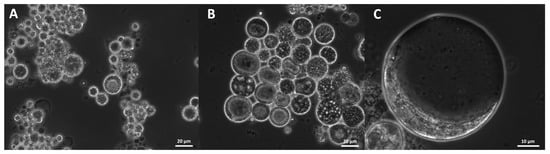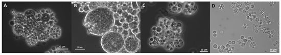 In addition to Ulkenia spp., “hatching” cells were observed in T. striatum N5997 and T. kinnei N1694d. These cells were mature and comparably large. Thus, the remaining cell wall remnants were also comparably large (up to 20 µm) and often slightly deformed. Similar empty cell walls were also observed in T. aureum N6007e (Figure S5T) but without the phenomenon of “hatching” cells. Microscopic observation suggests the development of sporangia only in a few strains. Few cells containing several spore-like cells were observed (Figure 10), e.g., in T. aureum N6006d and N6007e, S. aggregatum 561bx, N2820a, and 5999, T. striatum N5997, and Thraustochytriidae sp. N5670c. However, flagella as proof for zoospores were not observed, possibly due to the resolution. It might be that only aplanospores were built. These sporangia were also observed in the 7-day-old cultures used for inoculation, in T. striatum N5997, T. aureum N6006d and N6007e, Thraustochytriidae sp. N4994d, N4995d, and N5670c, and U. visurgensis 5594d.