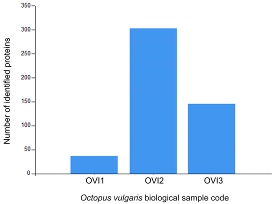 Relative label-free quantification of each O. vulgaris ink sample (OVI1, OVI2, OVI3) was also performed to determine the protein abundance of each sample. Supplementary File S1 contains these results. High-abundance proteins for each sample were analyzed and compared. Figure 2 shows the distribution of high-abundance proteins detected for each O. vulgaris ink sample, while Figure 3 (Venn diagram) shows the distribution and overlapping of high-abundance proteins for all O. vulgaris ink samples. The determination of proteins in these samples was directly influenced by ink sac sizes, sampling techniques, and protein precipitation. As was demonstrated in Figure 2 and Figure 3, the majority of the high-abundance proteins were detected in the OVI2 sample. In our study, the syringe method (OVI1) retrieved the fewest proteins, but the milking method after euthanasia generated the opposite outcome (Table 1, Figure 2 and Figure 3). Moreover, protein precipitation resulted in a minor loss of proteins for OVI1 and OVI3, whereas no purification led to the identification of significant protein abundance for OVI2. These hybrid collection methods offer a high coverage of the octopus ink proteome.