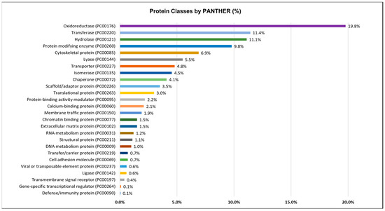 Figure 4 shows that oxidoreductase (19.8%), transferase (11.4%), hydrolase (11.1%), protein modifying enzyme (9.8%), or cytoskeletal protein (6.9%) were the most prominent protein classes. Protease (7.45%) was the most common protein modifying enzyme, followed by protein phosphatase, tyrosine protein kinase, serine/threonine protein kinase, and ubiquitin-protein ligase (Supplementary File S3).