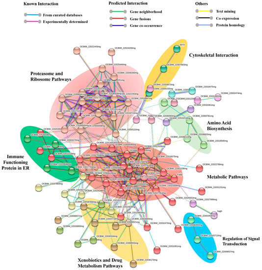 Subgroups of xenobiotics and drug metabolism by the cytochrome P45 (gold; 7 nodes) and immune functioning proteins in the endoplasmic reticulum (dark green; 4 nodes) such as calreticulin, disulfide isomerase family, and heat shock protein 70 family were also identified in the ink proteome. Cytoskeletal protein interactions (yellow; 3 nodes) were primarily formed by the actin and myosin proteins, while signal transduction regulation was mediated by small GTPase (blue; 3 nodes). All the proteins involved in these processes were also identified through molecular functional studies (Supplementary Files S3–S5).