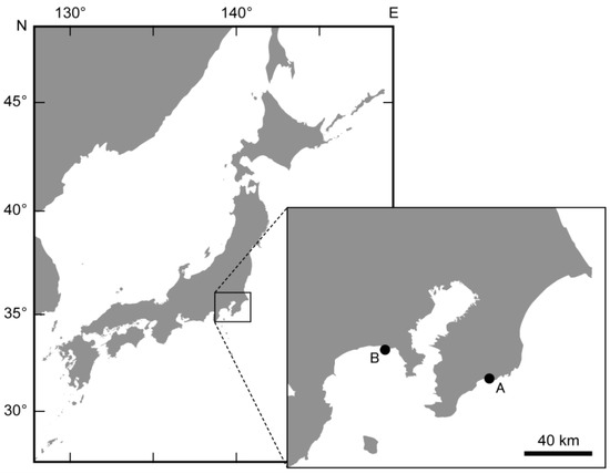 Sampling localities for the pufferfish Takifugu alboplumbeus used in this study. Sampling details can be seen in the inset: A, Kamogawa, Chiba Prefecture; B, Enoshima, Kanagawa Prefecture, Japan.