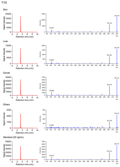 Sampling LC-MS/MS patterns of the TTX and 5,6,11-trideoxyTTX from the pufferfish Takifugu alboplumbeus, and 25 ng/mL standard. Left panels represent LC-MS/MS chromatograms, while the right panels represent the precursor and product ion mass spectra for TTX.