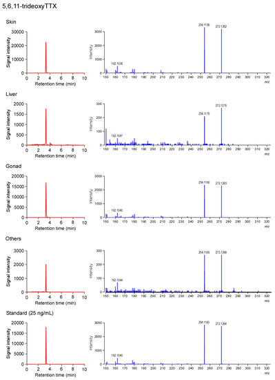 LC-MS/MS analysis demonstrated that TTX and 5,6,11-trideoxyTTX compounds were detected in all the individuals collected from Kamogawa and Enoshima (Figure 2).