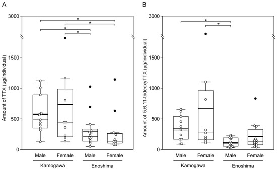 However, TTX levels were significantly higher in Kamogawa males and females than in their Enoshima counterparts (p < 0.05). 5,6,11-trideoxyTTX levels also tended to be higher in the Kamogawa population than in the Enoshima population: significant differences were observed between males in the Enoshima population and both sexes in the Kamogawa population (p < 0.05).