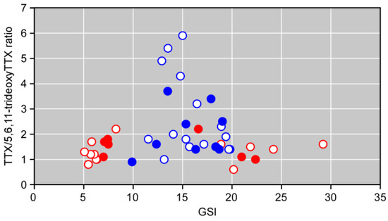The ratio of TTX to 5,6,11-trideoxyTTX did not differ between the Kamogawa and Enoshima populations (p > 0.05), with more TTX than 5,6,11-trideoxyTTX in all tissues except skin (Table 2). In the whole body, the ratios were 2.0 ± 0.8 and 1.4 ± 0.5 for males and females in the Kamogawa population (p > 0.05), respectively, whereas those for males and females were 2.8 ± 1.6 and 1.3 ± 0.4 in the Enoshima population (p < 0.05), respectively. At both Enoshima and Kamogawa sites, females had a TTX/5,6,11-trideoxyTTX ratio of 1–2 for both GSI below 10 and above 15, whereas males had a GSI clumped between 10 and 20, and many of them showed higher TTX/5,6,11-trideoxyTTX ratios compared to females (Figure 4).