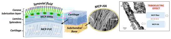 Schematic representation of a possible approach for OC scaffold development using marine-derived ingredients, from left to right. In particular, mutable collagen proteins (MCP) are characterized by adaptive interfibrillar cohesion, thus exhibiting mechanical competence and high regenerative ability. The non-mineralized cartilage-like layer, indicated as “cartilage”, can be obtained by functionalizing MCP matrix with fucoidans (FUC), capable to coordinate water molecules. Conversely, the subchondral bone layer can be obtained by MCP mineralized with ion-doped apatitic phases, thus acting as bioactive chemical signals for stem cells differentiation, as well as promoting the rising of bio-stimulating piezo/tribo-electric effect, as occurs in the natural osteochondral region.