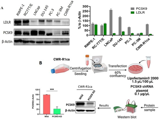 Western blot analysis of PCSK9 and LDLR expression in PC cell lines and overview and validation of PCSK9 knockdown in CWR-R1ca cells. (A) PCSK9 and LDLR expression levels in diverse PC cell lines (left panel). Densitometric analysis of PCSK9 and LDLR expression levels (right panel). (B) Overview of methodology and validation of the knockdown efficacy of PCSK9 in CWR-R1ca cell transfection using shRNA-plasmid specific to PCSK9. Western blotting showed a 75% PCSK9 reduction in transfected CWR-R1ca-KD cells compared to the wild-type cells. *** p < 0.01 for statistical significance. Scanning densitometry was obtained for all blots, carried out in duplicate, and the integrated optical density of each band was normalized with the corresponding density found for β-actin in the same blot. Results are shown in the bar graphs to their respective Western blot images. Vertical bars in the graph indicate the normalized integrated optical density of bands visualized in each lane.