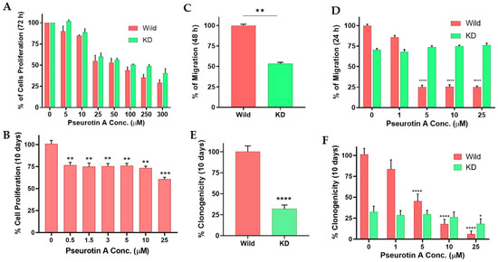 Cell migration is among the early steps in the metastatic tumor cascade. We investigated the role of PCSK9 KD on CWR-R1ca cells’ migration using the wound-healing assay. Results showed that PCSK9 KD notably suppressed the migration ability of CWR-R1ca cells. CWR-R1ca-KD cells lost ~46.7% of their migratory ability in comparison to the wild-type cells (Figure 2C). This finding indicated that PCSK9 could be critical for the migration of CWR-R1ca cells. Different PS treatment doses (1–25 µM) were used to assess their anti-migratory efficacy against the wild-type CWR-R1ca and CWR-R1ca-KD cells over 24 h after cells were scratched. Results showed the PS anti-migratory activity against wild CWR-R1ca cells, with an IC50 of 2.5 µM (Figure 2D). PS treatments had no effect on the migration of the CWR-R1ca-KD cells (Figure 2D). These findings demonstrated that PS dose-dependently and selectively suppressed the wild-type CWR-R1ca cells’ migratory activity, unlike its effects against the CWR-R1ca-KD cells, suggesting that targeting PCSK9 in CRPC may notably diminish its migratory ability.