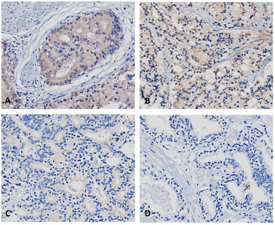 Expression of PCSK9 in PC tissue cores. PCSK9 expression was evaluated by immunohistochemistry in tissue microarray slide comprising 64 cases/192 PC tissue cores and 6 normal prostate cases/18 tissue cores. The protein expression was evaluated in tissues collected from PC patients at Gleason score 5 (A), GS = 7 (B), and GS = 8 (C) in addition to normal prostate tissues (D). Magnification is 400×.