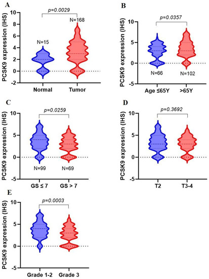 PCSK9 expression in PC tissues expressed as immunohistochemical score (IHS). PCSK9 expression in PC tissue cores was considered regarding normal tissue cores (A), age at diagnosis (B), Gleason score (GS) (C), pathological stages (T2–4) (D) and tumor grades (1–3) (E). Unpaired t-tests were performed, and significance of the data was calculated at p < 0.05.