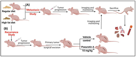Overview of animal studies design using CWR-R1ca-Luc cells. (A) Comparison of the impact of HFD versus regular diet on the progression and metastasis of CWR-R1ca-Luc cells in a xenograft nude mouse model. (B) Recurrence of suppressive effects of PS against the CWR-R1ca-Luc cells.