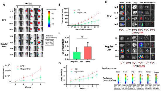 Effect of HFD on the progression and metastasis of the mCRPC CWR-R1ca-Luc cells xenografted into nude mice. (A) Biweekly live animal monitoring of CWR-R1ca-Luc cell bioluminescence. The upper panel shows the comparison of CWR-R1ca-Luc cells’ bioluminescence progression of individual mice in each of HFD- and regular diet-fed groups. The lower panel represents bioluminescence intensity monitoring in intact animals over the experiment course. (B) Comparison of the mean tumor volumes of HFD versus regular diet over the experiment course. Bars represent the mean tumor volume; error bars represent the SEM for each experimental group. (C) Comparison of the mean tumor weights for HFD-fed versus regular diet-fed mice at the experiment end. Error bars indicate SEM. (D) Mice body weight-monitoring data over the experiment course. Points represent the mean body weight of animals in each group. Error bars indicate SEM. (E) Bioluminescence and morphological comparison of collected organs from the HFD-fed (upper panel) versus regular diet-fed mice group (lower panel) at the end of the study. “ns” consider statistically not significant p > 0.5.