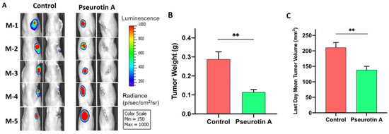 Surgical excision of CWR-R1ca-Luc mCRPC primary tumor. (A) Bioluminescence imaging of individual intact mice validated the efficacy of CWR-R1ca-Luc primary tumor surgical excision. (B) Comparison of the mean tumor weight of PS-treated mice (10 mg/kg for one week before surgery) versus vehicle-treated control mice. (C) Comparison of the last day mean tumor volume of PS-treated mice versus vehicle-treated control. Error bars represent the SEM for each experimental group. ** p < 0.01, for statistical significance.