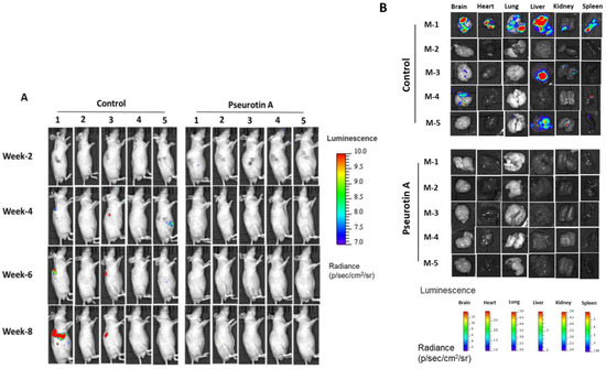 2.12. Pseurotin A Daily Oral 10 mg/kg Significantly Suppressed CWR-R1ca-Luc Tumor Locoregional and Distant Recurrences