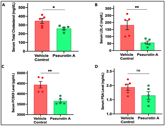 Systemic effects of PS treatments on mice serum cholesterol, LDL-C, PCSK9, and PSA levels. (A) Comparison of PS treatment effects on total serum cholesterol levels versus VC group. (B) PS versus VC treatment effects on mice mean serum LDL-C levels. (C) PS versus VC treatment effects on mice mean serum PCSK9 levels. (D) Treatment effects of PS versus VC on mice mean serum PSA levels. Error bars represent the SEM for each experimental group. Each point is the mean of triplicate. * p < 0.05, ** p < 0.01, for statistical significance. “ns” consider statistically not significant p > 0.5.